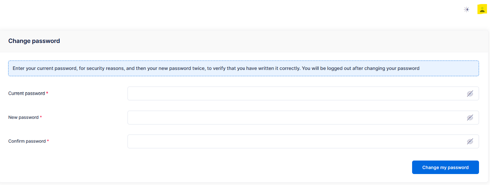 With this web-based application, individual users will be provided credentials by their system administrator (such as the Lyrasis Hosting team). The first time you login, you will be asked to change your password. You can do this from the small person icon in the upper right corner of the screen.