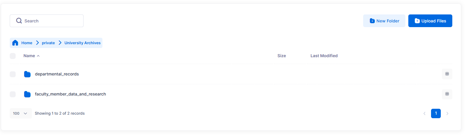 - After your upload is complete, you will see your preserved file structure with files. You can change how many search results appear on the screen if you like; the default is 10 results at a time, but you can increase up to 500.