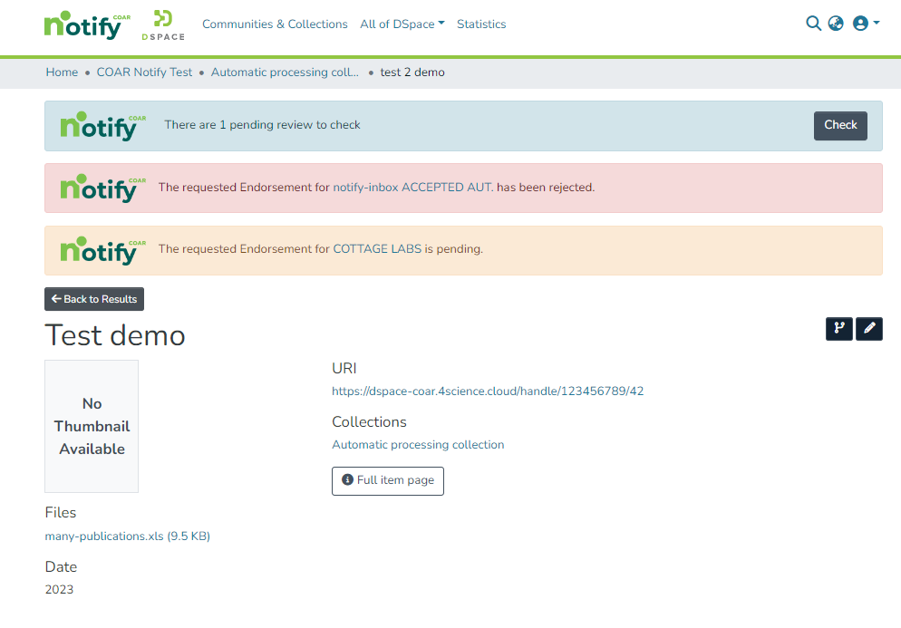 When Offer message has been followed by a related Announce incoming message, the box shown is blue! It is blue because receiving an Announce means - then the message is extracted - we produce a new QA Event. As every QA Event it is shown on Item Page and myDSpace page.