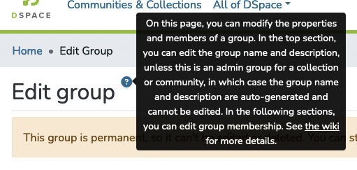 Contextual help tooltips are a feature to provide additional information about how to use DSpace to less experienced users without cluttering the interface for more advanced users who do not need additional instruction.