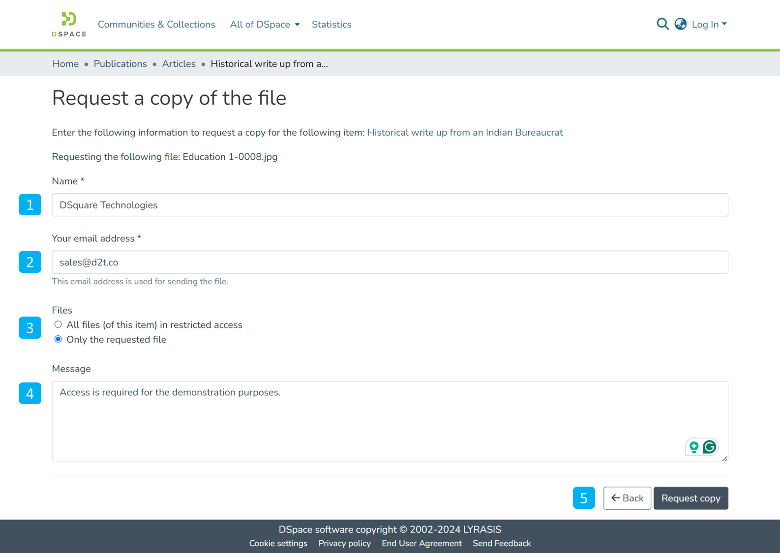 Step 2: Click the link to go to the Request-a-copy page and enter the required details. Inserting adequate details will help content contributors to understand the need and make an informed decision. Each element on the page is explained below