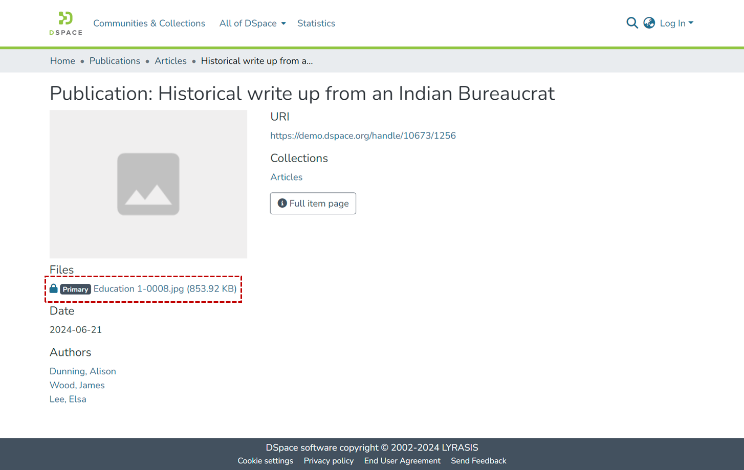 Step 1: Users should locate the desired item and navigate to its detail page. This can be done through various methods such as browsing, searching, or using taxonomy navigation. If the bitstream is restricted, a lock icon will appear next to the bitstream link, as highlighted in the screen below.