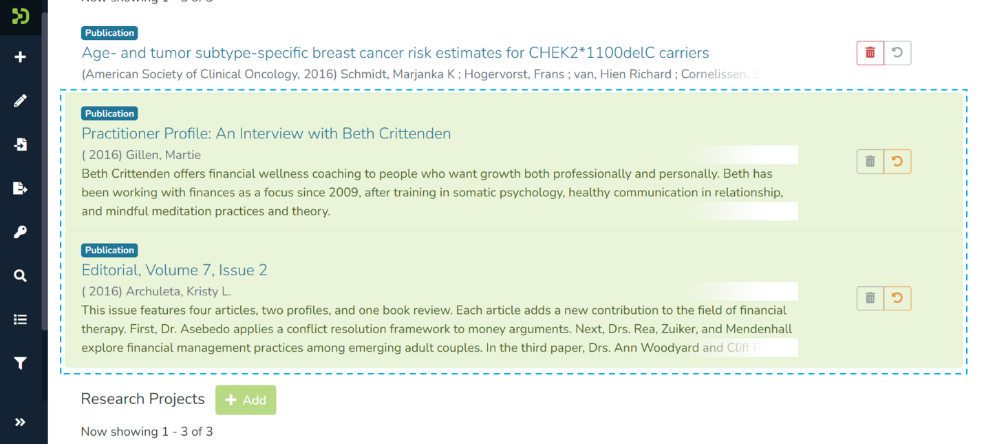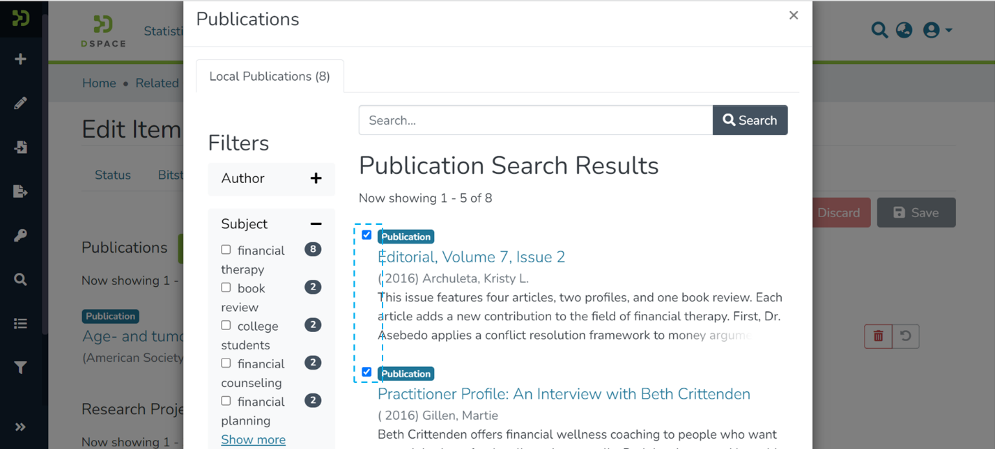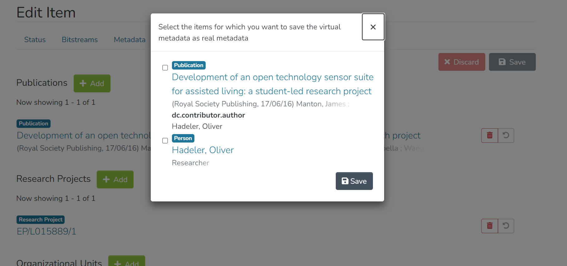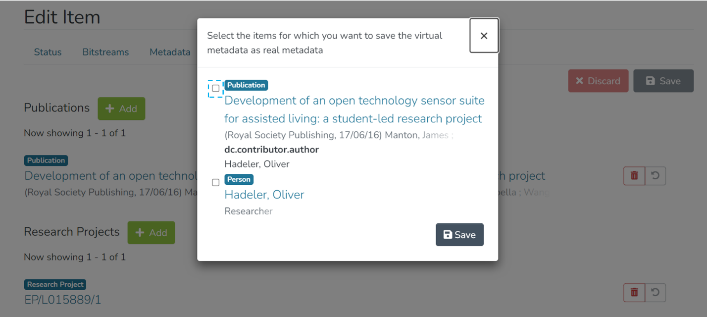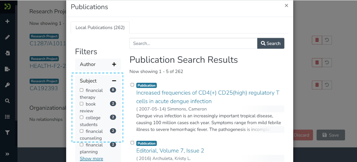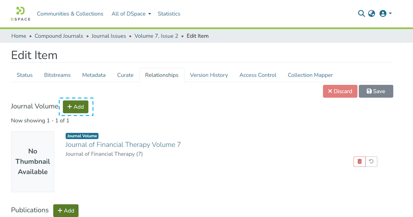 Step 1: Click on the “Add” button next to the relationship type to map Item (s) under each relationship type. For example, click on the “Add” button next to Publications to add an item as a related publication.