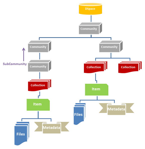 The way data is organized in DSpace is intended to reflect the structure of the organization using the DSpace system. Each DSpace site is divided into communities, which can be further divided into sub-communities reflecting the typical university structure of college, department, research center, or laboratory.