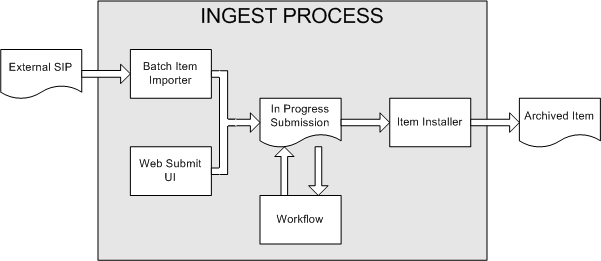 Rather than being a single subsystem, ingesting is a process that spans several. Below is a simple illustration of the current ingesting process in DSpace.