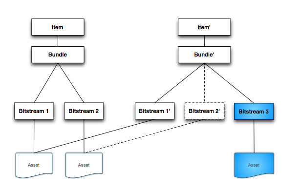 For every new Version a separate DSpace Item will be created that replicates the metadata, bundle and bitstream records. The bitstream records will point to the same file on the disk.