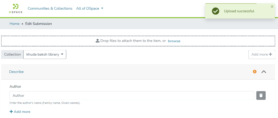Step 6: After uploading bitstream, the next step is to describe the Item by adding metadata.