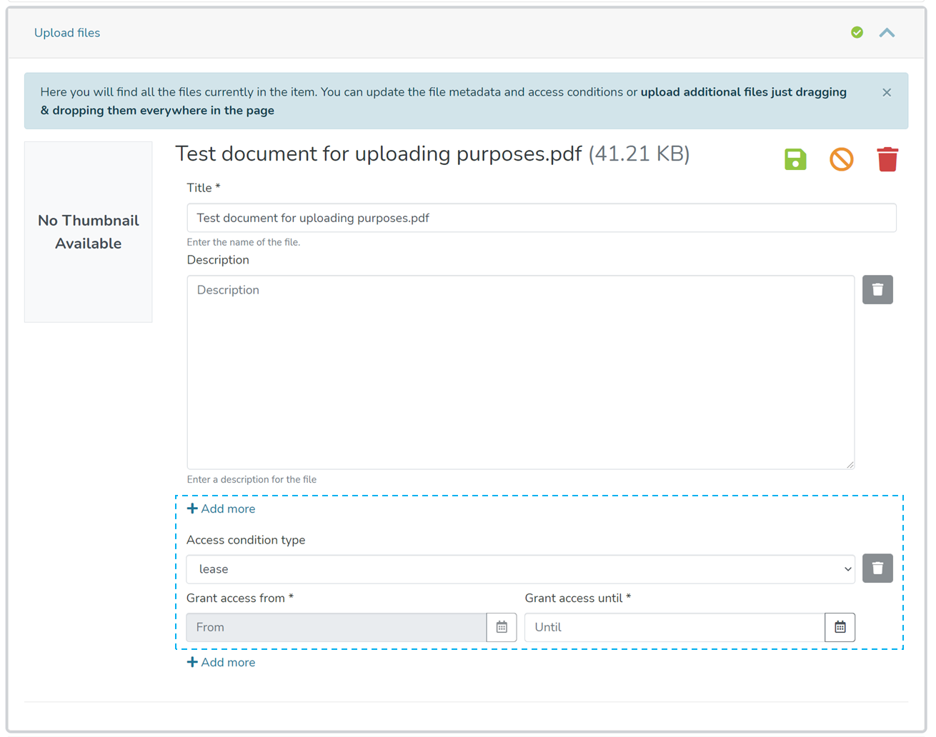 After selecting the lease, the “Grant access until” date field will be activated. Next, choose the future date, after which the attachment should be restricted to the larger set of DSpace users.