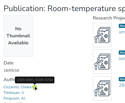 For ORCID iDs that have been associated with a user profile (Person Entity), either by a user connecting their authenticated ORCID iD with their profile, or an administrator adding an unauthenticated ORCID iD to a Person Entity profile: the ORCID iD icon will appear next to the user's name on any works landing pages where the user is an author, with the user's ORCID iD displayed upon hovering over the ORCID iD icon. Authenticated ORCID iDs will appear as a green ORCID iD icon: