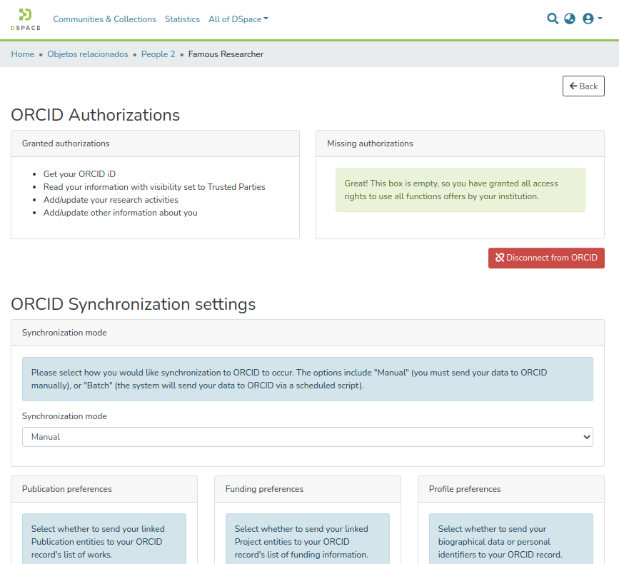 The researcher can connect (or disconnect) their DSpace local Researcher Profile with ORCID from the Person item detail page.