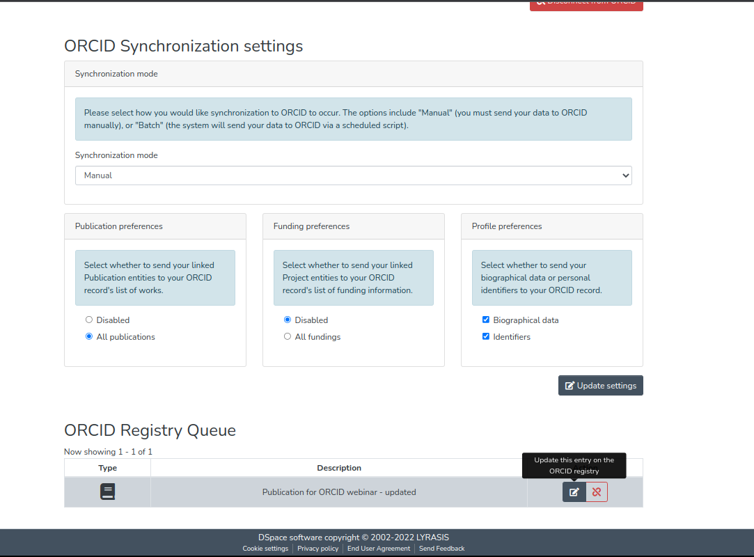 The synchronization can happen automatically over the night or manually. The list of information that should be pushed or updated from DSpace to ORCID is presented in a queue and can be manually discarded or immediately pushed by the researcher.