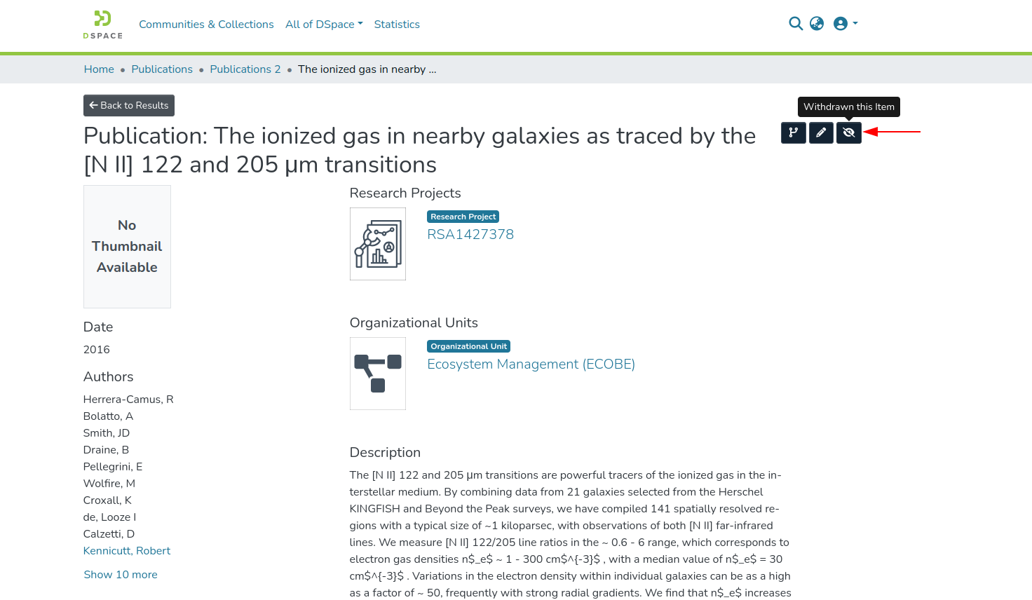 The user can withdraw an item from the details page of the archived item. Any authenticated user has the permission to withdraw an item.