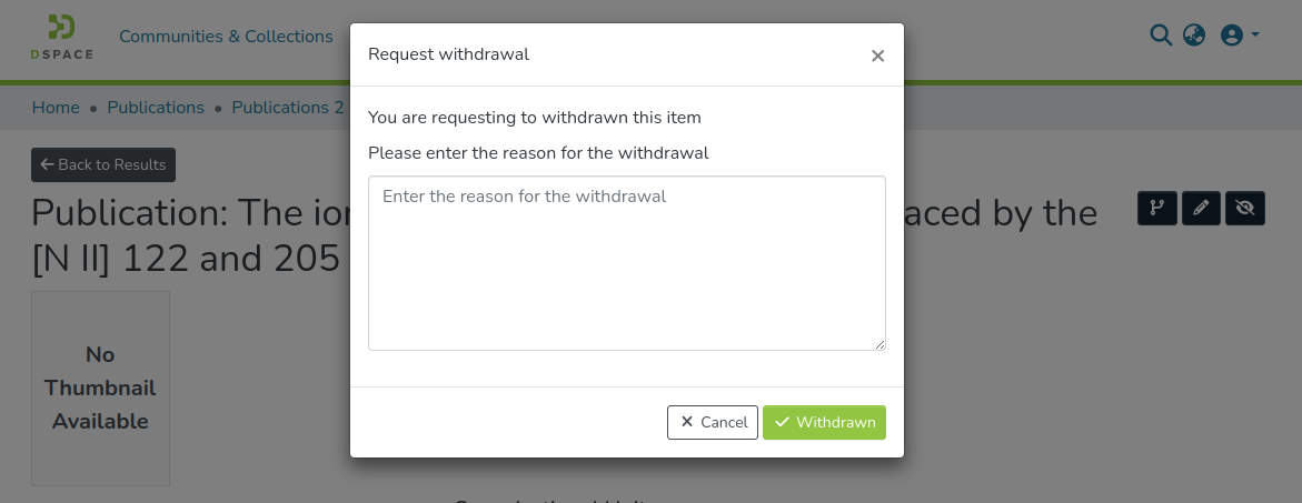 Once enabled, when you are logged in you will see a "Request Withdrawal" or "Request Reinstatement" button on Item pages (depending on their current status). See example screenshots below.