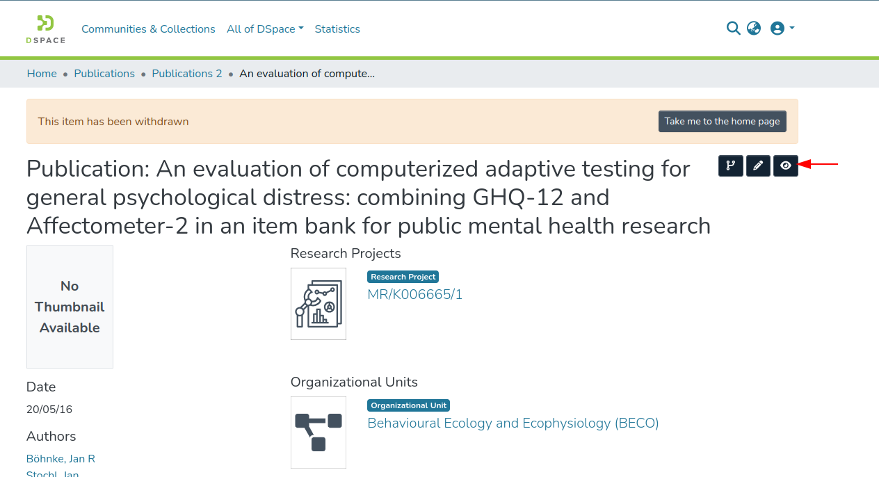 On the page of a withdrawn item, the administrator can use the eye icon on the top right to proceed with a request for reinstatement.