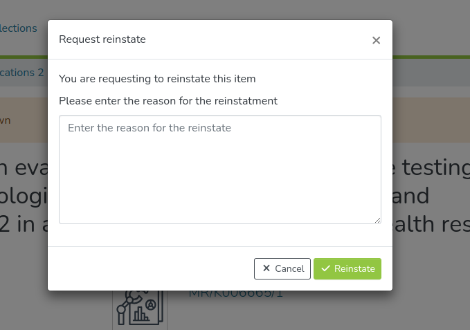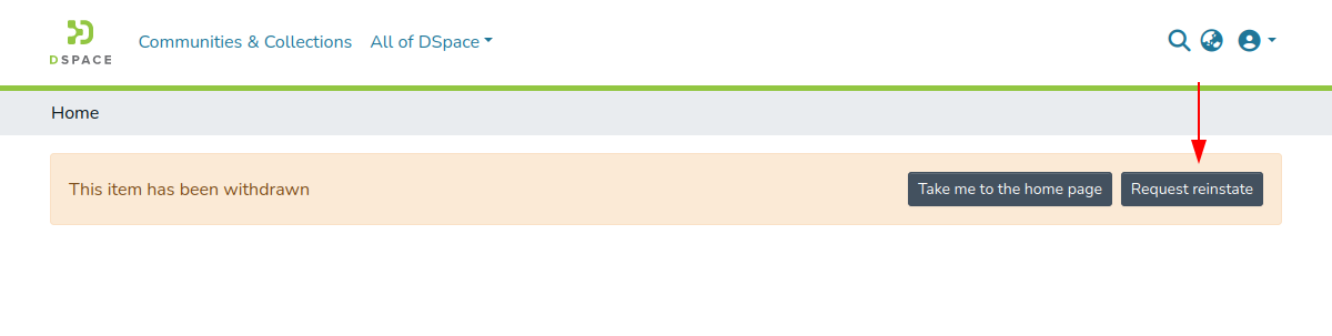 In particular, the submitter will see a “Reinstate” button available next to the “Take me to the home page” button on the withdrawn item page and will no longer see the item's details.