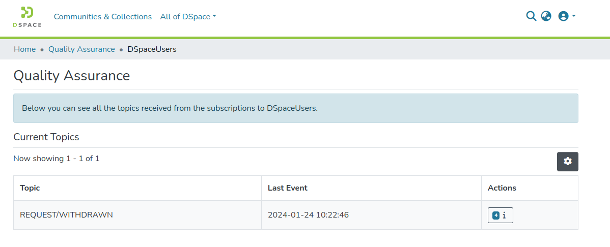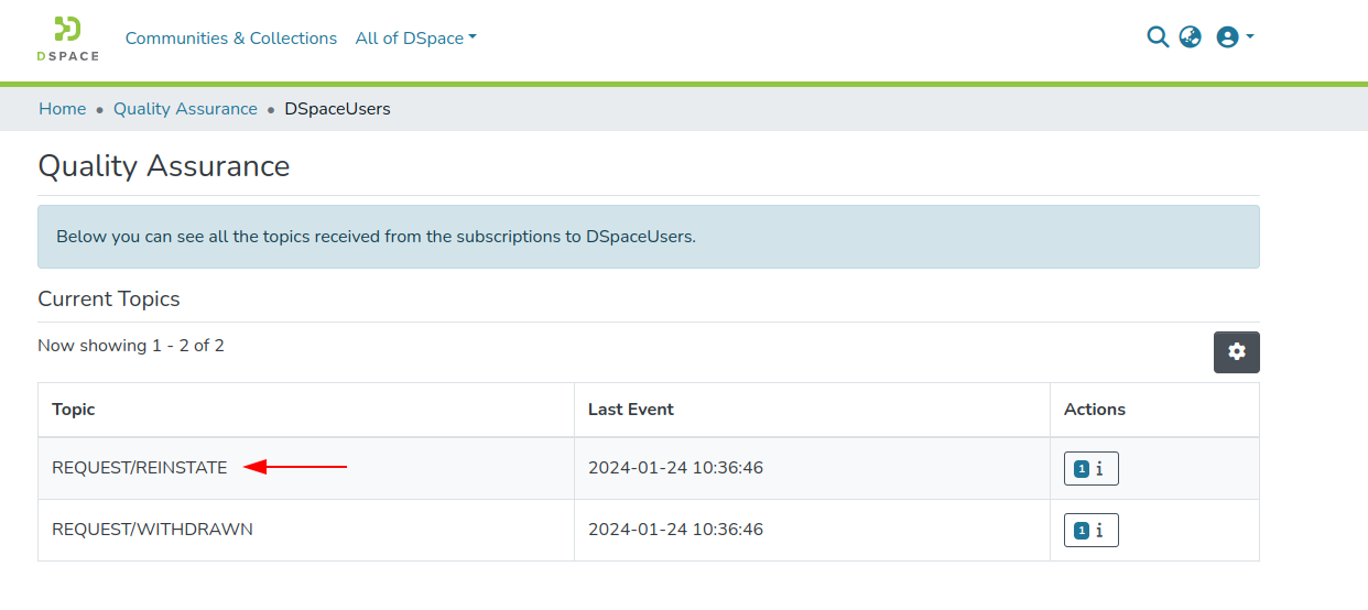 Clicking on View on the item page will lead to the "Quality Assurance" page, which lists the topics/requests. In case there is only one topic available, it will automatically redirect to the item list.