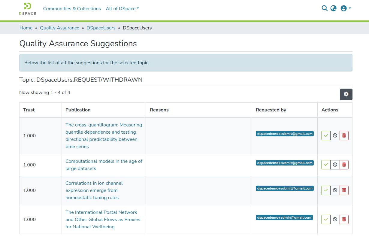 Like in the case of withdrawal, administrators can access all the requests for all the items from MyDspace.