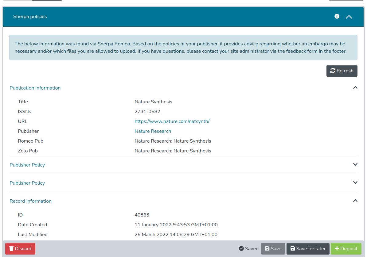 The step needs to extract the ISSN of the Journal where the publication has been submitted/published to query the Sherpa/RoMEO database in order to visualize the publisher policies, this is done by an implementation of the org.dspace.app.sherpa.submit.ISSNItemExtractor interface configured in the org.dspace.app.sherpa.submit.SHERPASubmitConfigurationService