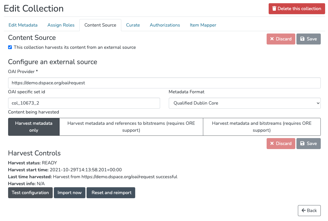 Existen dos opciones para configurar una colección para la recolección de contenido. Una es utilizando los scripts de DSpace llamados "harvest", y la otra es configurando la fuente de contenido (content source) de una colección a través de la interfaz de usuario.