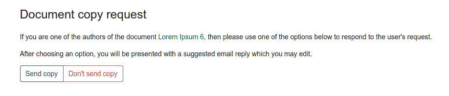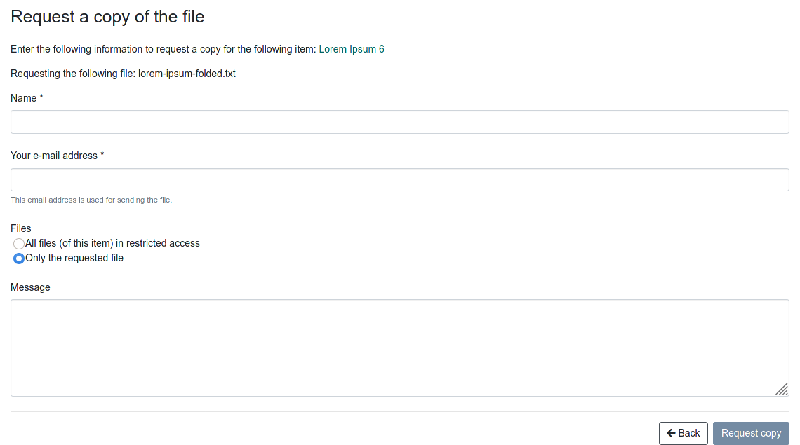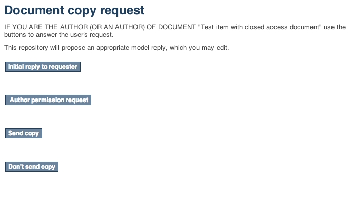 La funcionalidad "Solicitar una copia" se añadió a DSpace como una medida para facilitar el acceso en aquellos casos en que el contenido cargado no puede compartirse abiertamente con todo el mundo inmediatamente después de su envío a DSpace. Proporciona a los usuarios una manera eficiente de solicitar acceso al remitente original del ítem, quien puede aprobar este acceso con un solo clic. Esta práctica cumple con la mayoría de las políticas aplicables, ya que el remitente interactúa directamente con el solicitante en cada caso particular.