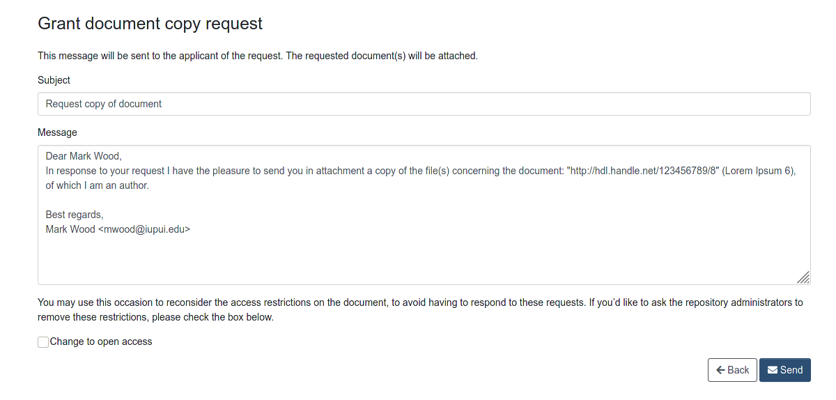 Al responder positivamente a una solicitud de copia, la persona que aprueba también puede solicitar al administrador del repositorio que modifique los permisos de acceso del ítem para permitir el acceso abierto sin restricciones a todo el público, marcando la opción "Cambiar a acceso abierto".