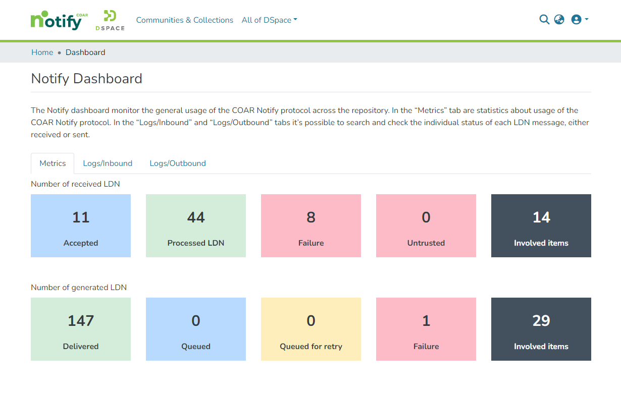 The “Metrics” tab displays data about usage of the COAR Notify protocol, showing the number of received (accepted/processed/failure/untrusted) and generated (delivered/queued/queued for retry/failure) LDNs, and the total number of items involved.