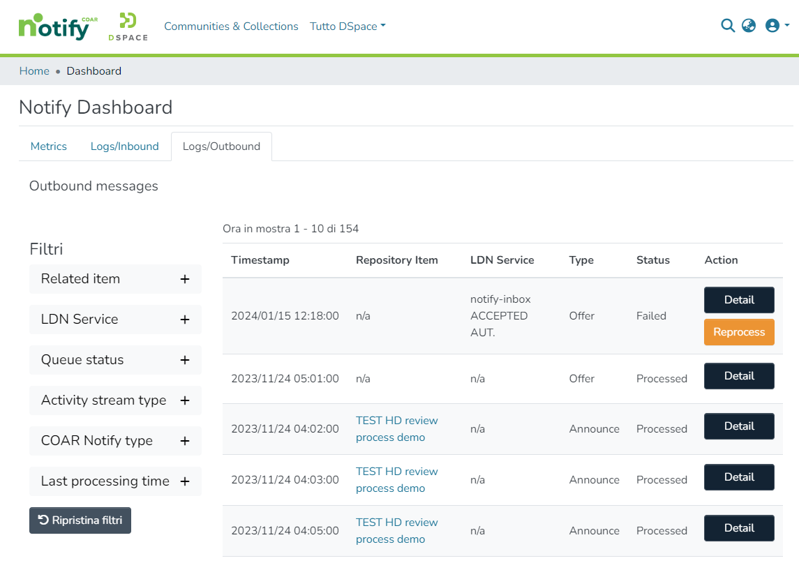 This allows administrators to reprocess messages received from LDN services that have not yet been registered in the repository, or whose data (i.e. service URL and IP range) have not been correctly entered in the LDN service registry.