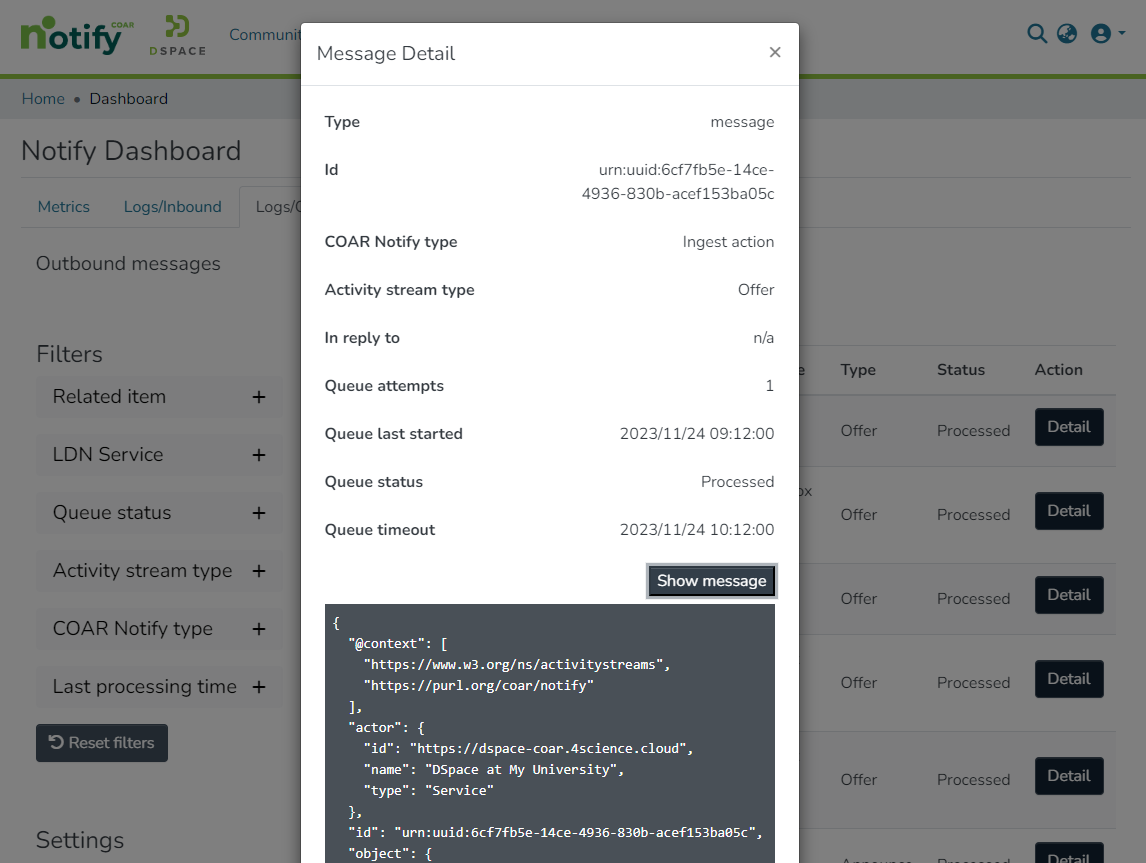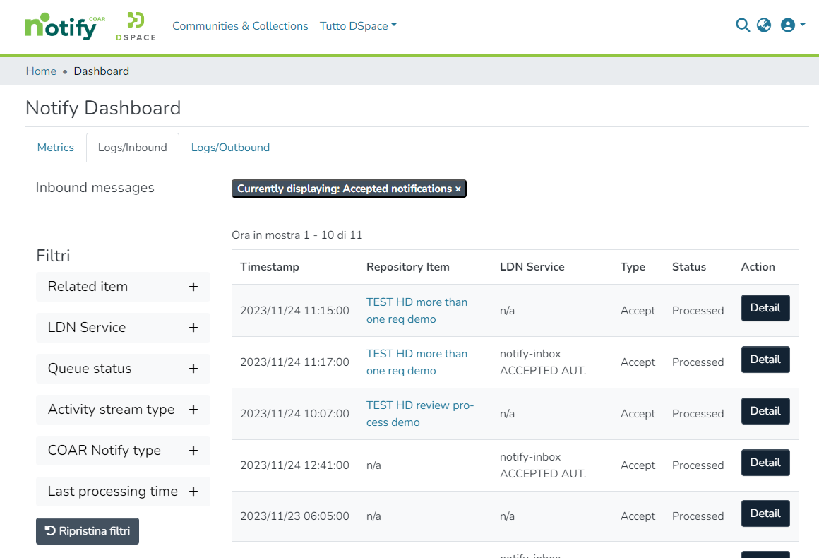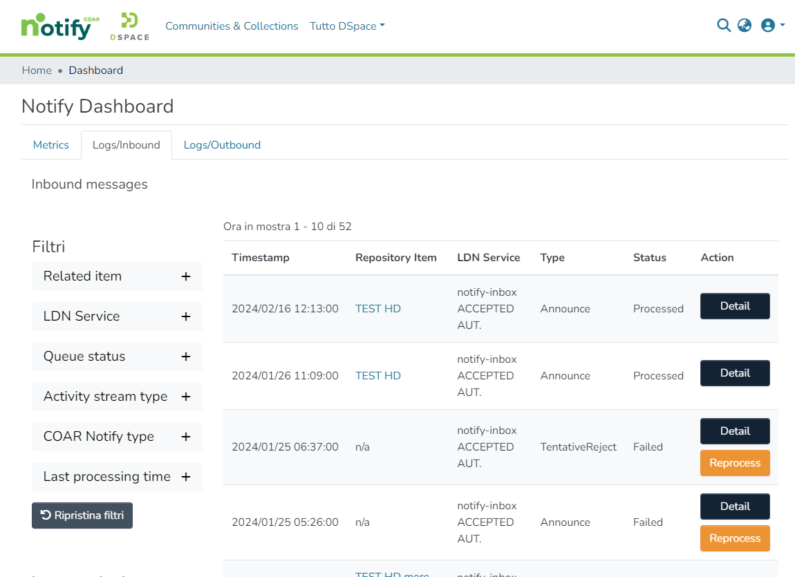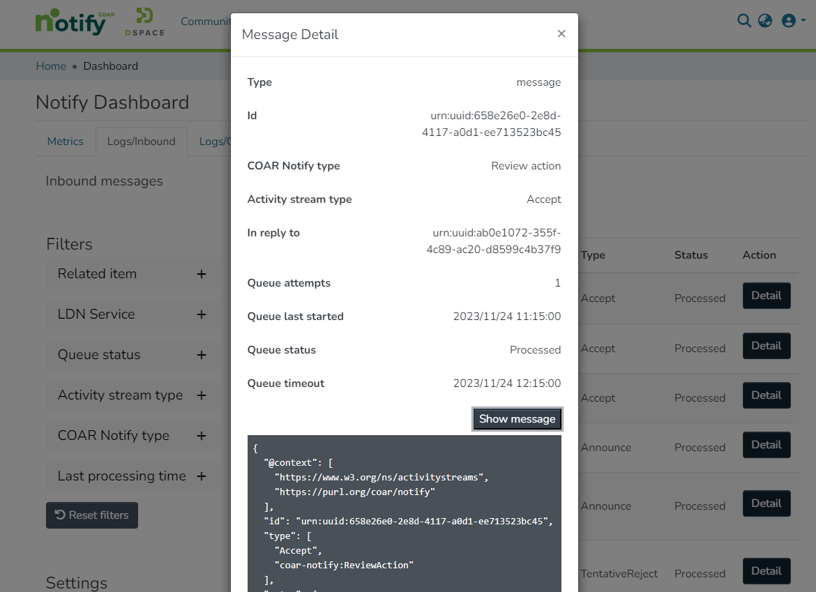 In the “Logs/Inbound” tab it’s possible to search and check the individual status of each LDN message received by the repository.