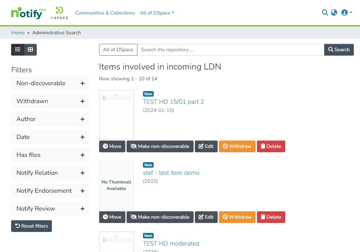 Items can than be further filtered also for any COAR Notify metadata (notify.relation.endorsedBy, datacite.relation.isReviewedBy, and datacite.relation.isReferencedBy) using the facets.