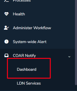 The dashboard is accessible to repository administrators only via the menu voice COAR Notify > Dashboard.