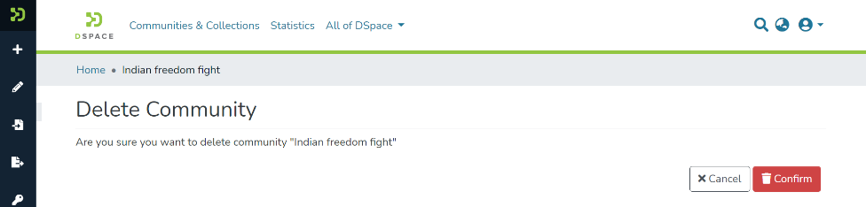 Users will be redirected to the homepage of DSpace upon successful completion of the community deletion, and a popup confirming the community deletion will appear.