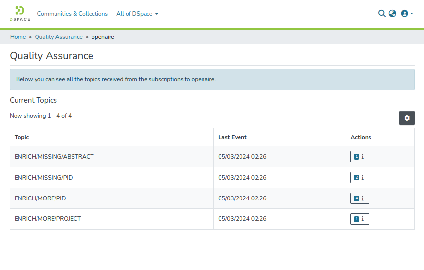 /api/integration/qualityassurancetopic to provide access to summary information about the available topic and number of events to deal with/api/integration/qualityassuranceevent to provide access to the detailed events so that they can be reviewed and managed by the repository managerThe detailed REST contract for such endpoints are available on the 4Science Rest7Contract repository and embedded at the bottom of the page for easy reference.