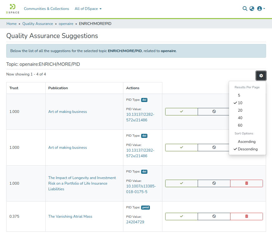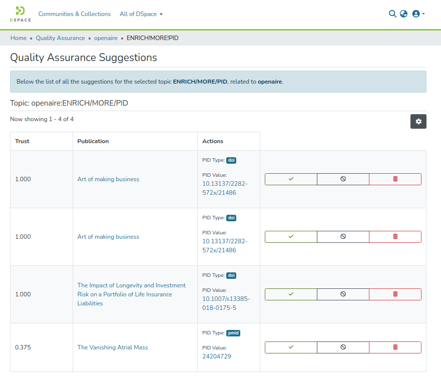 Below a screen of possible missing abstract events, where the repository manager will be able to check the current local publication record clicking on the title and scroll the abstract reported by OpenAIRE. Accepting the suggestion, the local record will be enriched with this extra information. The Ignore suggestions button is instead intent to be used to discard a notification without flagging it as wrong. This is important because the OpenAIRE Graph process the data from the repository not in real-time so it can happen that a local record has been updated recently with information not yet known to OpenAIRE. In such scenarios it could be possible that the repository manager prefers to keep the local version but this should be not reported to OpenAIRE a wrong suggestion as this feedback can be used to improve the OpenAIRE guessing capabilities. In contrast a wrong suggestion should be rejected so that OpenAIRE can learn from that.