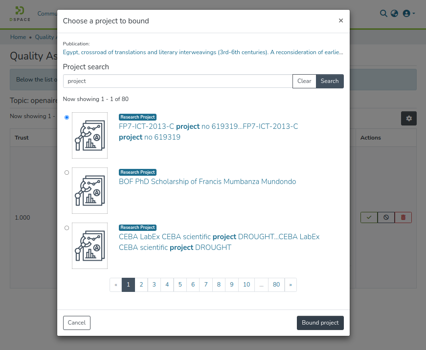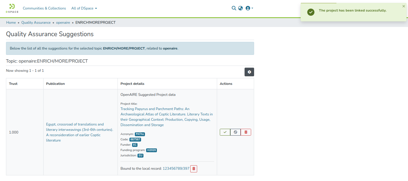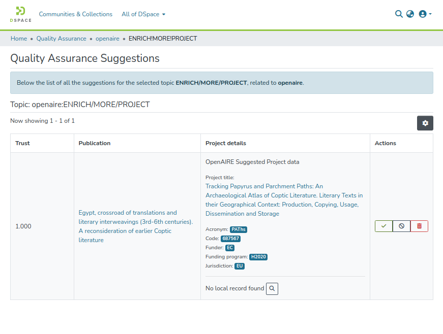 The system will attempt to identify a local record for the information reported by OpenAIRE (the project) and will offer to the repository manager the option to manually lookup the record or fix the automatic match