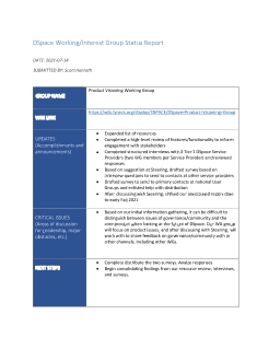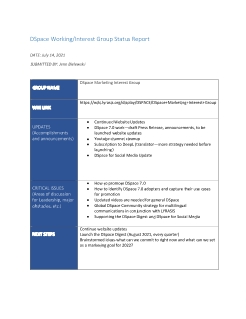 Jenn informed that the marketing working group has been meeting twice a month. One meeting is devoted to general DSpace issues and the other one on DSpace 7. The group is also discussing updates to the website and social media. There are plans to launch of a new DSpace Digest in mid-August, and the group is also working on annual DSpace report.