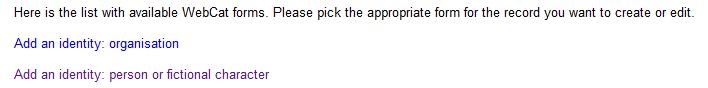 Click one of the two links, either for organizations (corporate bodies) or persons. This opens a one-page template that contains the fields found under various tabs when editing an existing record.