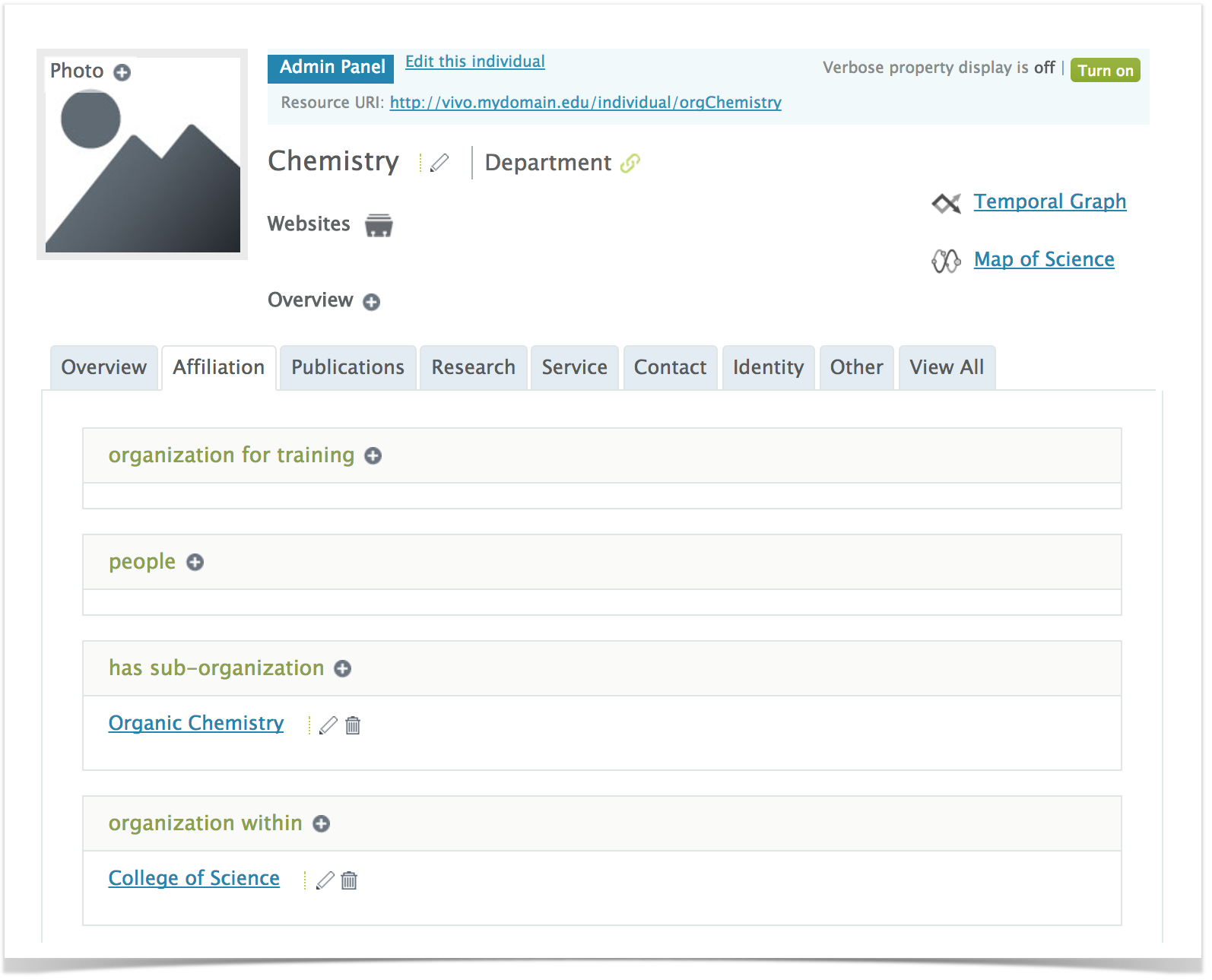 | http://vivo.mydomain.edu/individual/orgChemistry | department | Chemistry | http://vivo.mydomain.edu/individual/orgCollegeOfScience |