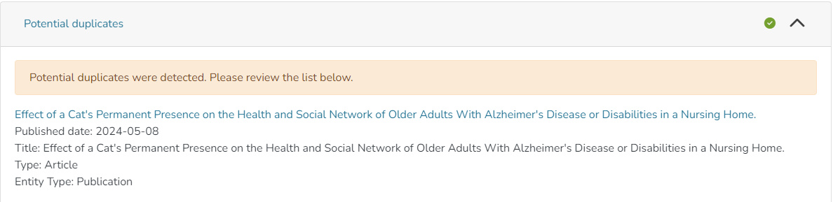 Duplicates can be searched via a submission step, to warn submitters or editors of potential duplicates while they are editing metadata for an in-progress item, and also with a new /duplicates REST item link which will search and retrieve a paged list of potential duplicates for any item.